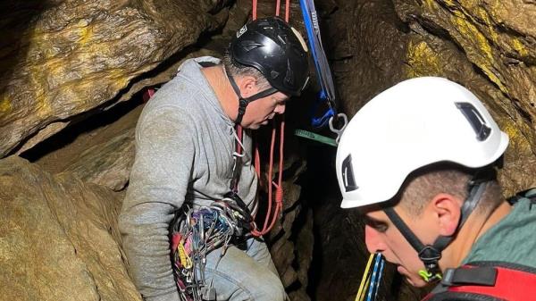 救援人员凿穿岩石把人从洞中解救出来