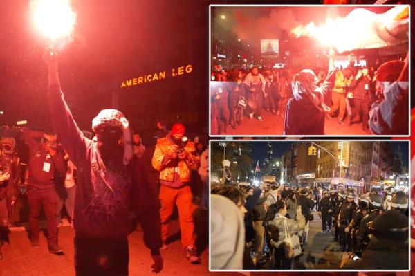 手持照明弹的抗议者在纽约警察局总部游行,超过150人在纽约大学被捕