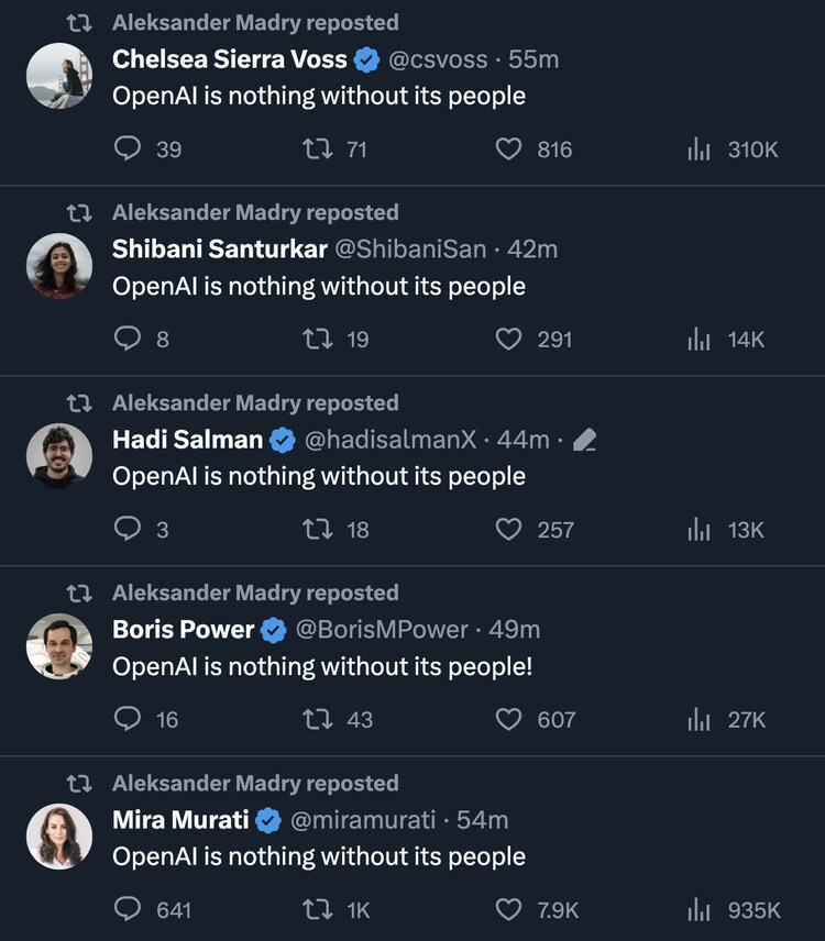 但Murati并不孤单。有几十名OpenAI员工在推特上发表同样的言论,就像他们同声高呼“没有人,OpenAI什么都不是”。